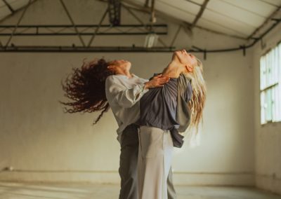PIES DE GALLINA es la exploración del vínculo entre dos mujeres, donde el equilibrio entre sostener y derrumbarse centra el encuentro. Inspirada en las expresiones “tener la piel de gallina” y “andar con pies de plomo”, se investiga la tensión entre lo sensitivo y lo racional, tejiendo una relación de apoyo y vulnerabilidad entre estos cuerpos. Ser una sola para existir en un equilibrio siempre al borde del colapso.